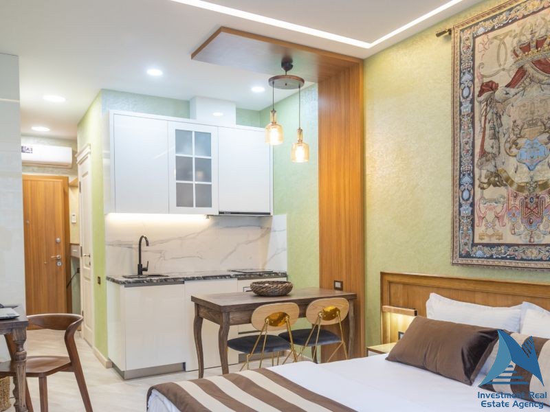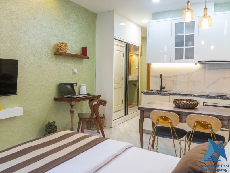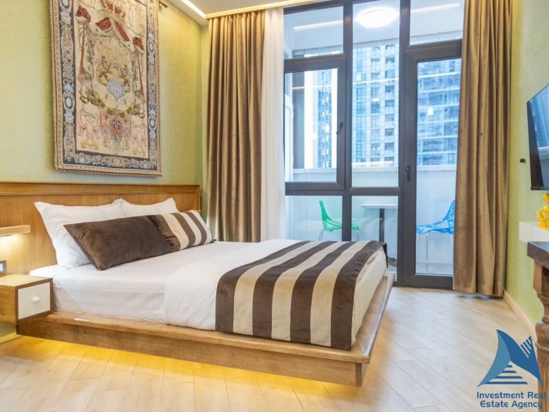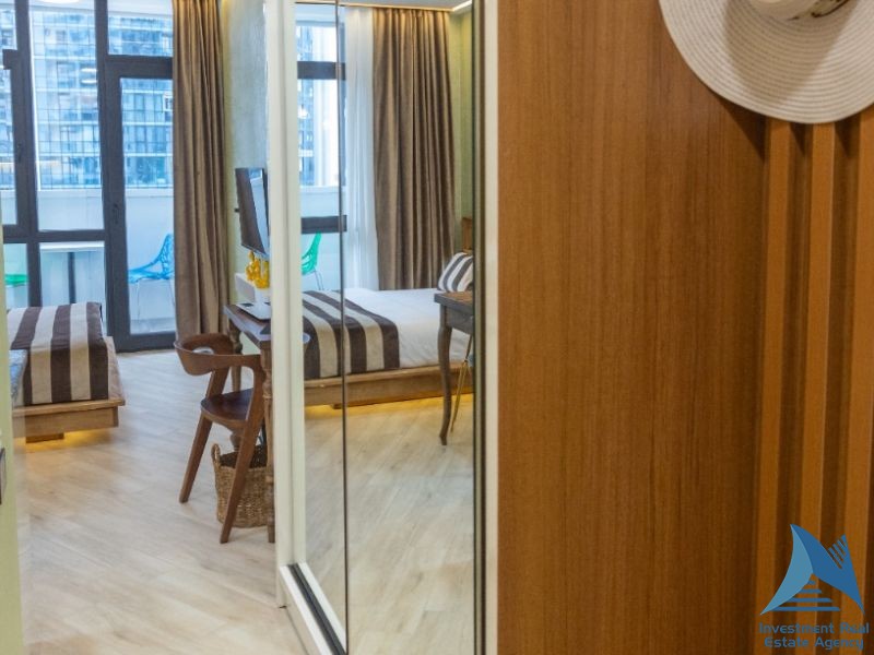 იყიდება სტუდიოს ტიპის ბინა შარტავას ქუჩაზე, ალია პალასში 21 სართული 26მ2 ავეჯით ტექნიკით, ზღვის ხედით მოცეკვავე ფანტანებთან ახლოს, აივნით, ფასი: 46500$
